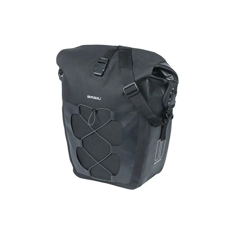 Toile/polyester 600D imperméable. Coutures soudées haute fréquence. étanche (IPX3) (tests Basil beaucoup plus élevés que la norme IPX3 standard). 2 boucles pour fermer le sac. 1 sangle de compression avec boucle. Cordon élastique réfléchissant réglable (pour le rangement d’un casque ou d’une veste). Réfléchissant sur 3 côtés par des logos et des rectangles. Bandoulière amovible et réglable. Crochet/rail inférieur.