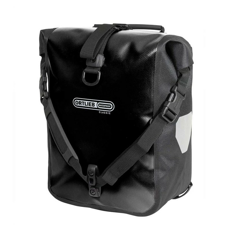 Sacoche universelle à fermeture par enroulement pour low-rider ou porte-bagages arrière (pour vélos enfant par ex.) ; système Quick-Lock 2.1 pour porte-bagages dont le diamètre de tube ne dépasse pas 16 mm, toile polyester à revêtement PVC avec poche intérieure incluse, bandes réfléchissantes et sangle de portage en bandoulière.